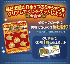 毎日ミッションを5つクリアすることで「くじ」をもらえ、1月5日に当選することでアイテムをゲット出来ます。